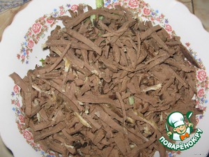 Сердце также соломкой. Остудить лучше в бульоне. Так сочнее.
