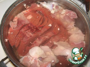 Отвариваем сердце. Вариться оно будет долго, но можно сделать это заранее. Солим по вкусу ещё при варке. Варить часа 2 - не меньше. У меня сердце варилось вместе с куриными желудочками, они мне нужны были для другого блюда, так что не обращайте на них внимания.