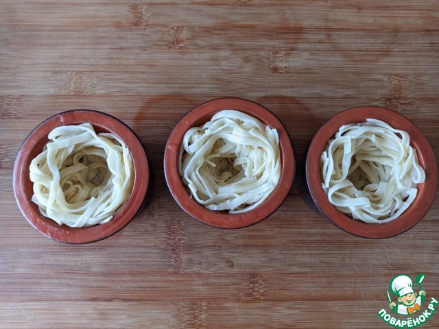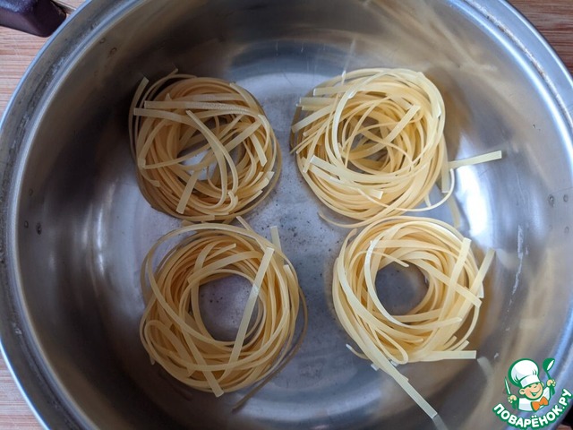 Для приготовления берём макаронные изделия "Гнёзда", отвариваем до полуготовности, согласно инструкции на упаковке.