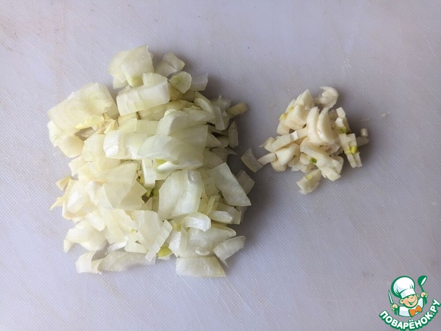 На сковороду кладём сливочное и растительное масло, обжариваем на среднем огне лук и чеснок до мягкости около 3 минут.