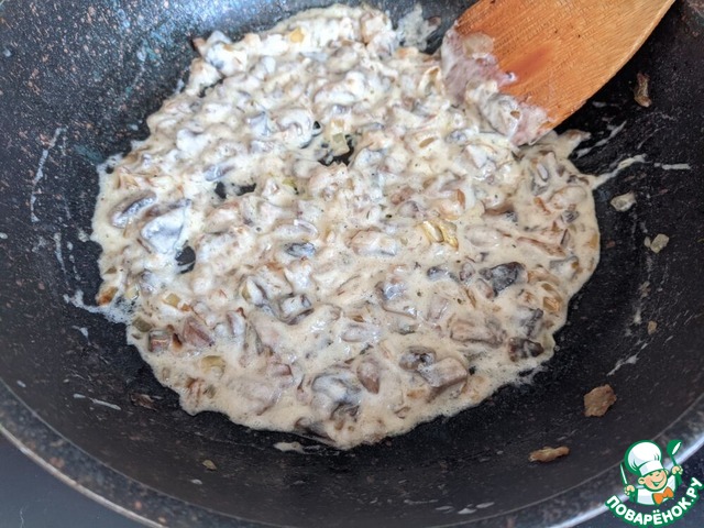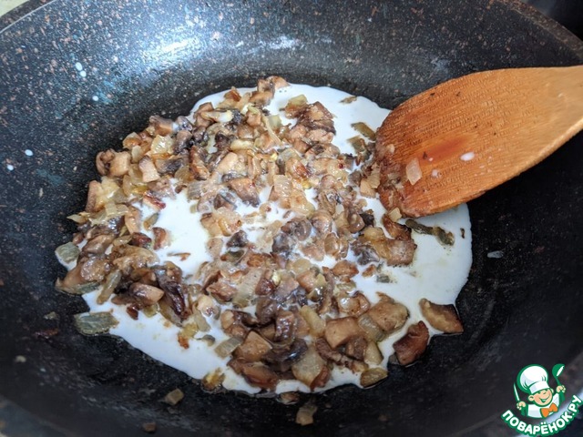 Добавляем вино (можете не добавлять), перемешиваем. Наливаем молоко, сливки, кладём соль, перец, перемешиваем.