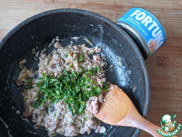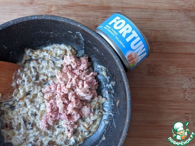 Добавляем размятый вилкой тунец без жидкости. У меня ТМ FORTUNA.