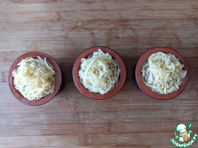 Посыпаем тёртым сыром. Ставим в духовку на 200 градусов под верхний нагрев или гриль на 15 минут до подрумянивания сыра.