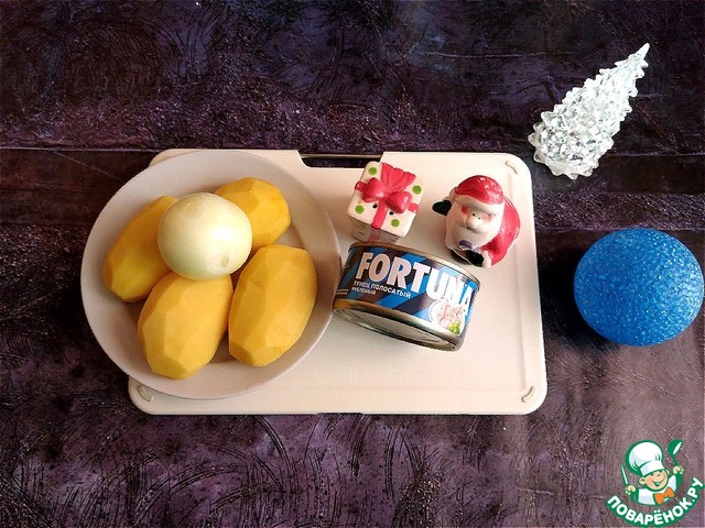 Картофель нужно отварить для пюре в подсоленной воде. В начинке я буду использовать консервированный рубленный тунец в с/с ТМ FORTUNA. Можно использовать любой сорт консервов из тунца той же марки, в том числе - и в масле.