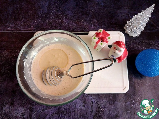 Выливаем в посуду воду с майонезом, разбиваем яйцо, кладём соду, сахар и соль. Перемешиваем тщательно венчиком.