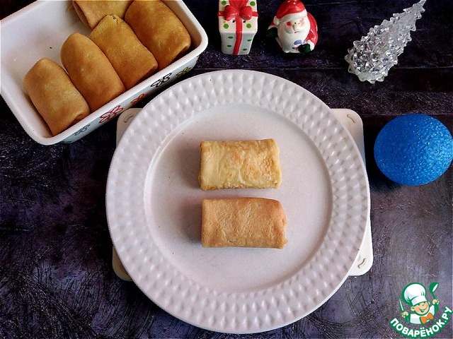 Из количества этого теста я выпекла 7 шт тонких блинов D-24 см. Начиняем блины. Выкладываем начинку примерно 2 ст л на каждый блин. Подворачиваем края с обеих сторон и скручиваем блин.