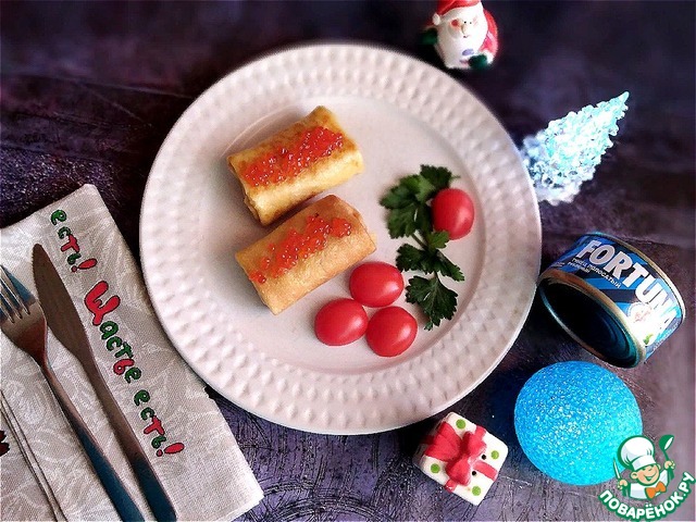 Какой же праздничный стол без фаршированных блинов? Я делаю всегда и их всегда съедают. Сегодня я приготовила блины, тесто которых для такой начинки сделаю на майонезе. Мы получим тонкие и мягонькие блины для фарширования, которые очень подойдут для начинки из картофельного пюре с обжаренным луком и рубленным консервированным тунцом. Празднично украсить блины можно по своему вкусу. Но в новогодние праздники для подачи я блины украшу красной икрой.