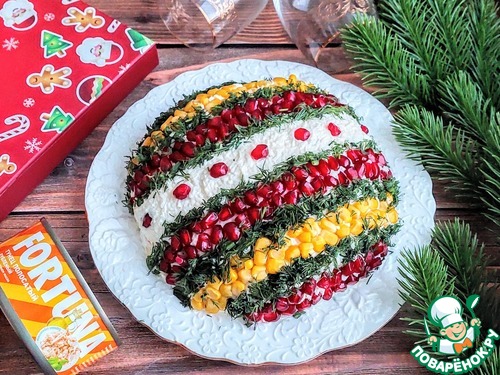 Далее я украсила салат зернами граната, кукурузы и мелко нарезанным укропом.
