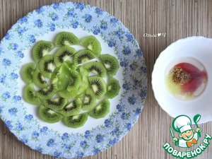 Киви очистите, нарежьте полукружочками, выложите на тарелки. Для заправки соедините все ингредиенты.