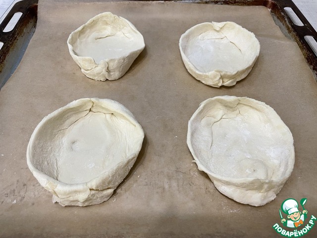Для приготовления слоек один пласт слоеного дрожжевого теста разрежьте на 4 части. Края теста немного загните вверх, чтобы при выпечке начинка не развалилась.