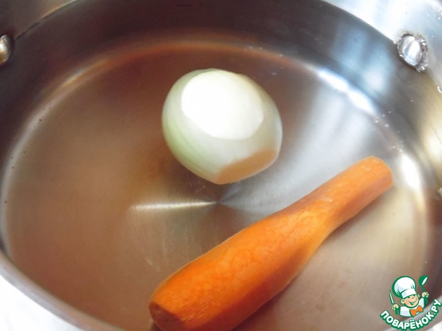 Спустя указанное во втором шаге время достать из кастрюли луковицу и морковь - они нам больше не понадобятся.