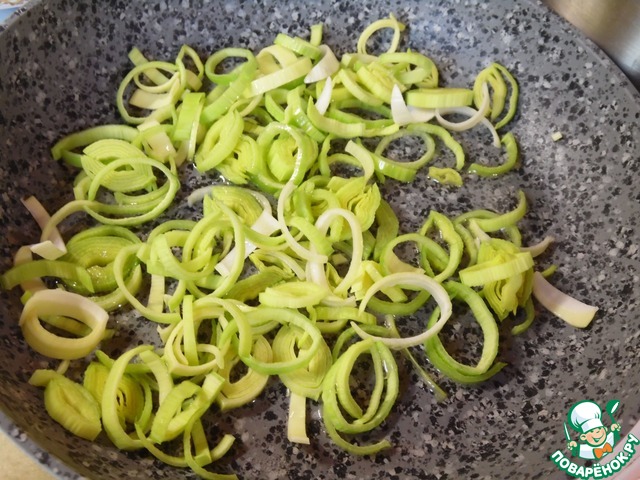 Лук-порей нарезать кружочками, обжарить на растительном масле 3-4 минуты.