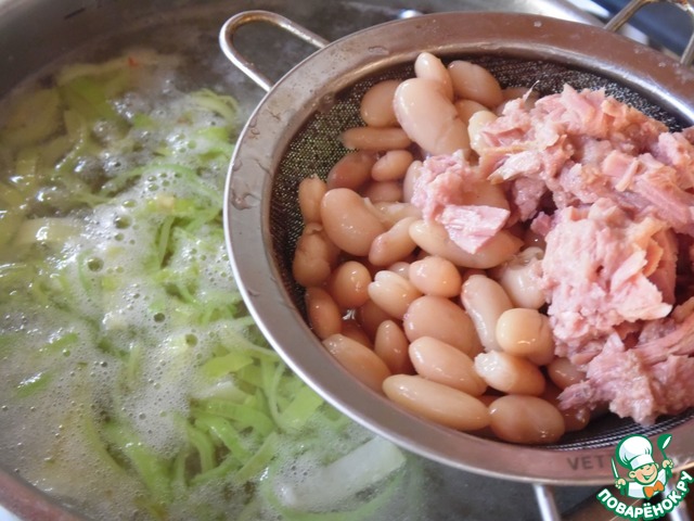 К картофелю выложить обжаренный порей, белую консервированную фасоль (предварительно слив из нее жидкость) и тунец (вместе с соком). Варить еще 5-10 минут.