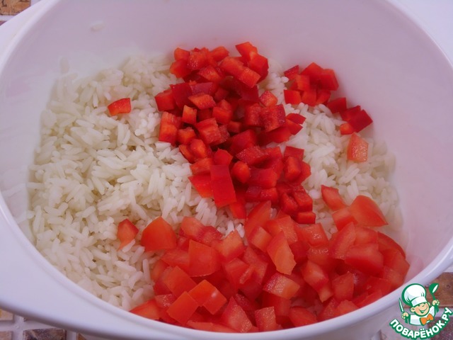 Перец и мякоть помидора (без семян и жидкости) нарезать мелкими кубиками. Выложить к рису.
