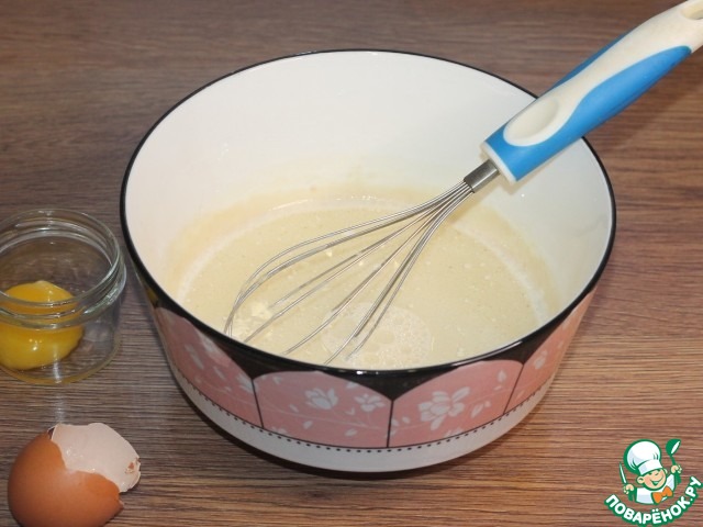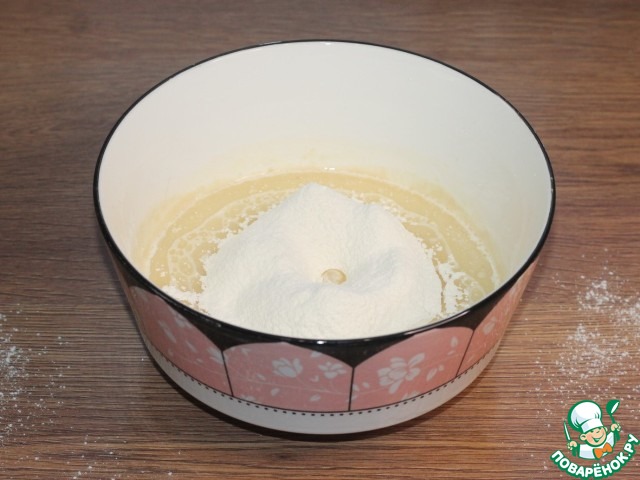 3. В жидкую смесь небольшими порциями просеиваем муку и замешиваем тесто. Немного муки, 1/4 часть оставляем.