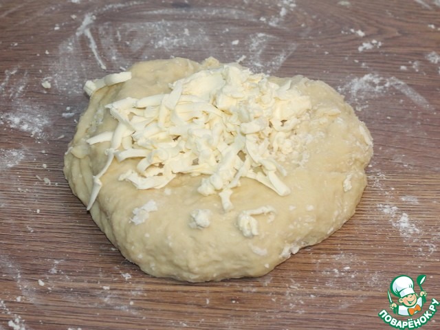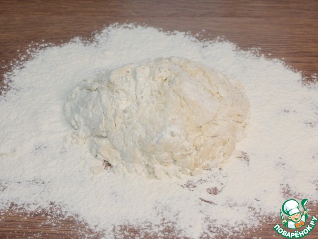 4. Подпыляем столешницу мукой и выкладываем тесто. Добавляем оставшуюся муку и вмешиваем в тесто.