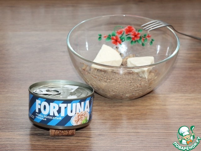 8. Выкладываем тунец без жидкости в миску. Добавляем плавленный сыр и измельчаем вилкой.