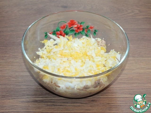 9. Добавляем в миску тертое яйцо и перемешиваем начинку.