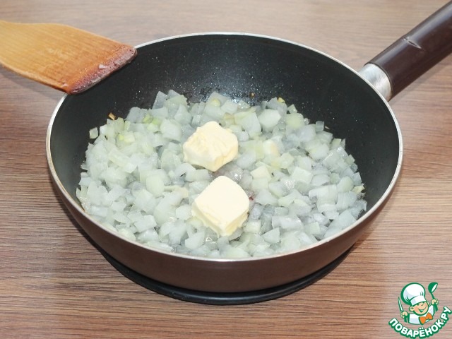 10. На разогретом растительном масле (2 ст. л.), обжариваем лук до золотистости.