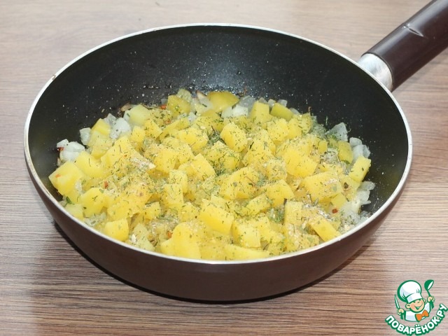 11. Растапливаем кусочки сливочного масла и высыпаем картофель. Добавляем приправу и специи, перемешиваем и 2-3 минуты держим на огне.