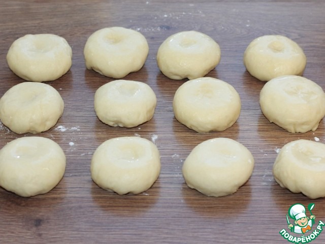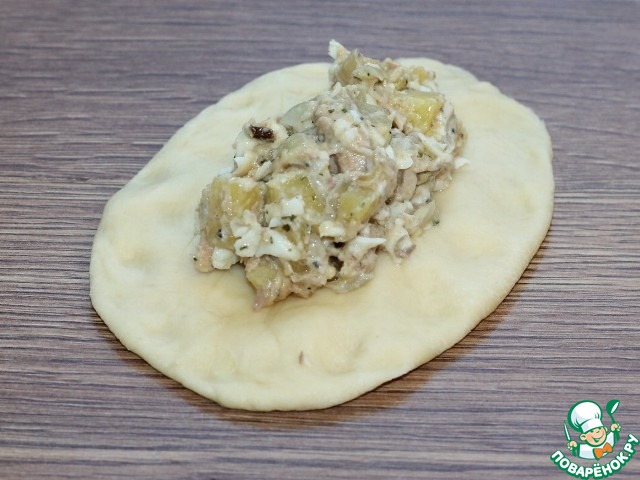 16. Поочередно раскатываем кругляки теста в лепешки и раскладываем начинку по 1 ст. л. с горкой.