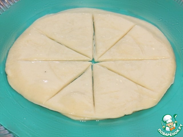 Две части теста раскатываем в круг Ф= 17 см и выкладываем в середину формы. Каждый круг, смазываем растительным маслом.