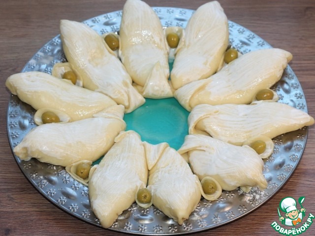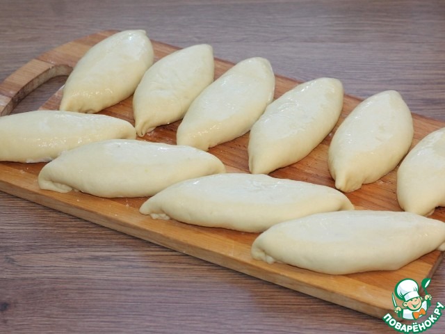 20. Смазываем пироги жидкой сметаной и оставляем в теплом месте на пол часа. Пирожки подошли, смазываем их взбитым желтком (1 желток+1 ст. л. воды) и выпекаем в уже разогретой до 180 С духовке, минут 25-30 или до румяной корочки.