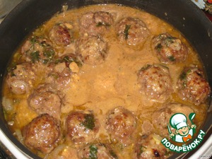 По истечение 30-35 минут, соус добавить к тефтельками, перемешать и потушить при открытой крышке еще 7-10 минут