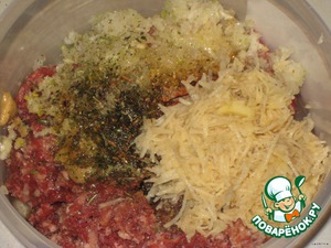 В говяжий фарш добавить соль, перец (по вкусу), натертую луковицу, выдавить чеснок (1-2 оставить для соуса), 1 ч. л. меда, 2 ч. л. соевого соуса, 1 ч. л. смеси сушеных трав (орегано, майоран, базилик), 1 ч. л. горчицы и натертый на мелкой терке сырой картофель и 2-3 ст. л. растительного масла Все хорошо перемешать и дать постоять фаршу 30 минут.