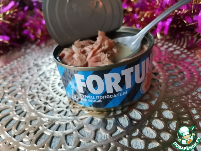 • Для приготовления салата я взяла баночку (185г) полосатого рубленного тунца ТМ "FORTUNA".