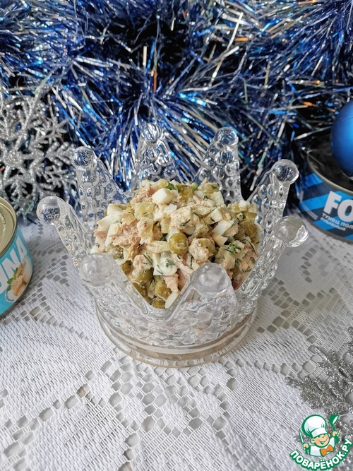Не знаю достоин ли этот салат короны, но то, что он вкусен, прост в приготовлении и доступен всем и каждому, я ручаюсь. В рецепте отсутствуют, привычные для рыбных салатов, рис и картофель. Салат нетяжёлый, несухой, вкусный и, наверное, скорее дамский. Угощайтесь!