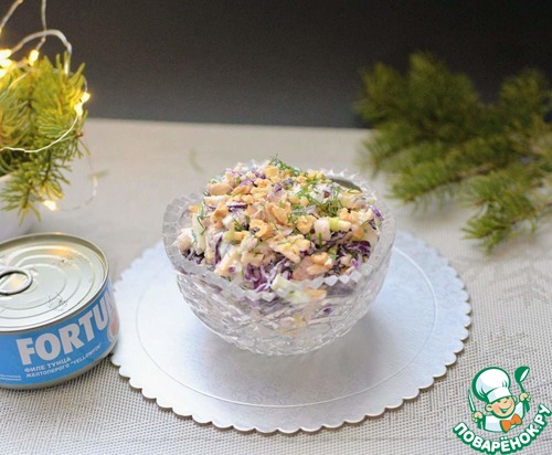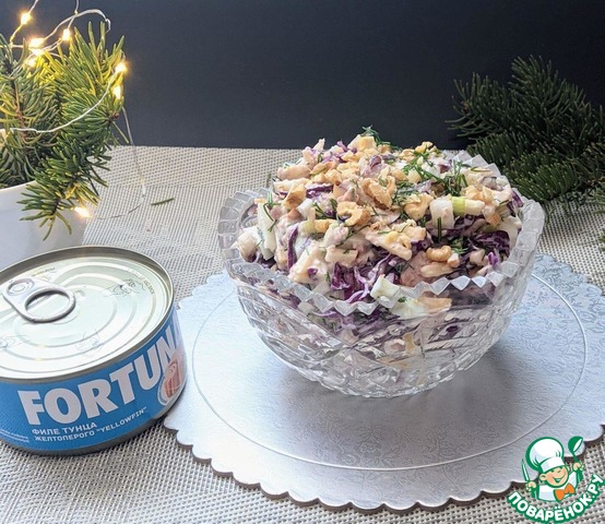 Идею рецепта этого салата подглядела в интернете. Там, в оригинальном варианте, салат был с сайрой. Заинтересовало необычное сочетание продуктов, решила сделать с тунцом. Оказалось очень ярко и насыщенно по вкусу. Рекомендую!
