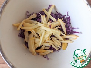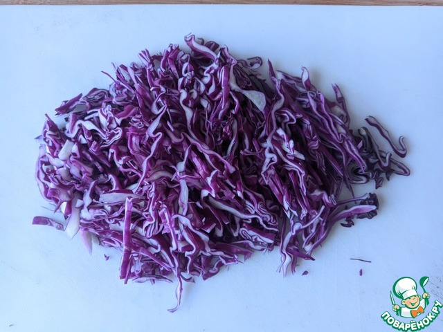 • Краснокочанную капусту тонко шинкуем, посыпаем солью, обминаем.