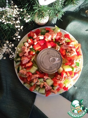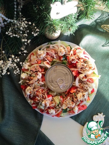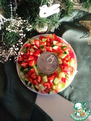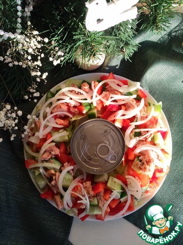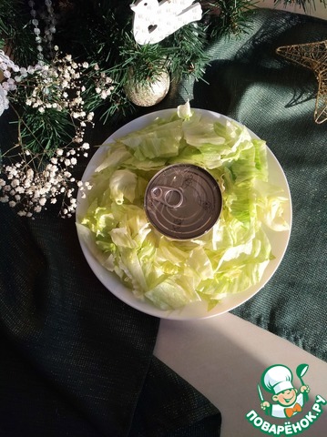 Салат мы будем делать в виде венка. Для этого возьмём большое блюдо и в центр поставим что-нибудь круглое (кольцо, стакан, блюдце и т. п.). Мне отлично подошла баночка тунца, предварительно я её обернула в пищевую плёнку) Выкладываем салат по кругу.