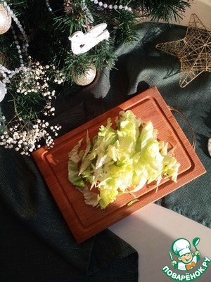 Сперва измельчаем листья салата Айсберг, их можно порезать, либо просто порвать руками.