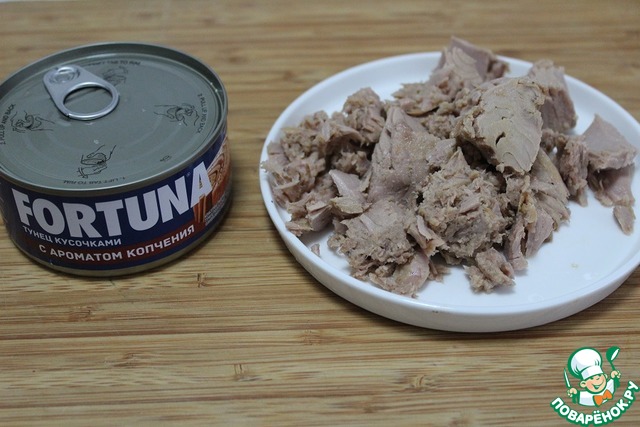 - Тунец (тунец кусочками с ароматом копчения ТМ Fortuna) — 1 бан.
