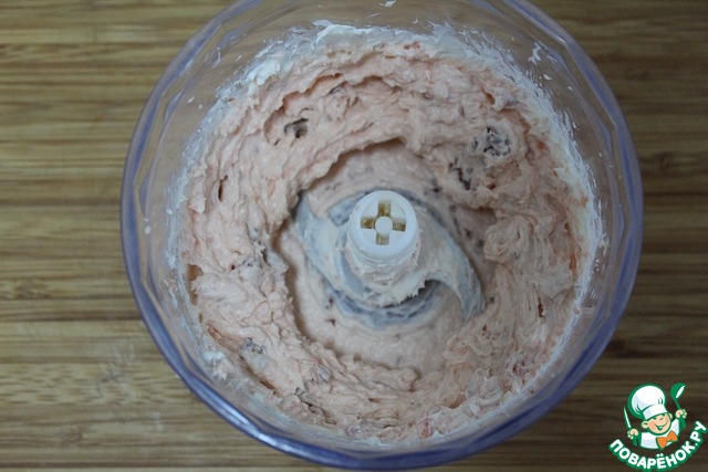 В блендер положить 100 гр творожного сыра, порезанные вяленые помидоры и форель.