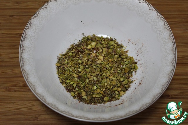 Орехи обжарить и порезать кешью не мелко, а фисташки мелко.