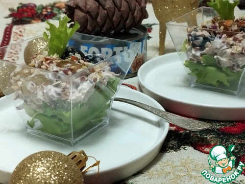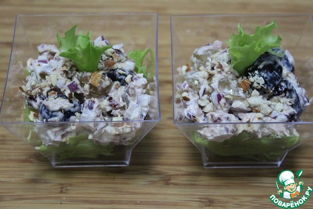 Салат готовила для прекрасной половины, но и сильной половине он очень понравился! Сочный салат с легкой сладостью винограда и кислинкой клюквы, с нежным тунцом и миндальным послевкусием. Пробуем?