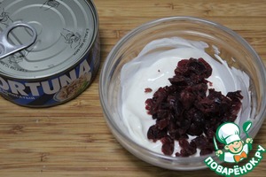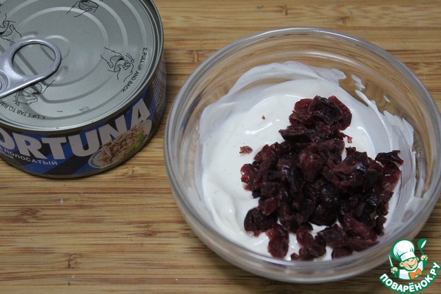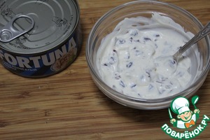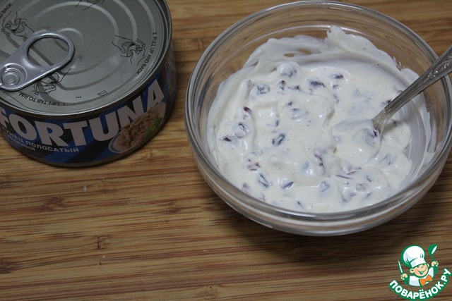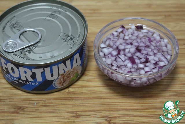 - Тунец (рубленный в собственном соку ТМ Fortuna) — 0.5 бан.