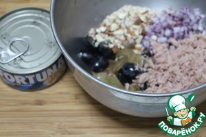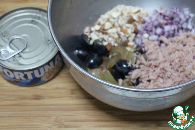 В чашу выложить тунец, обсушенный лук, виноград и миндаль (оставить чуть на подачу).
