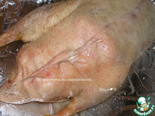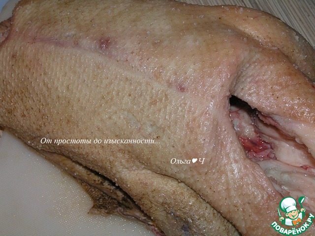 Духовку предварительно разогрейте до 220°С. Тушку гуся вымойте, хорошенько просушите бумажным полотенцем, удалите большие куски жира и проткните вилкой по всей поверхности кожи. Натрите солью тушку изнутри и снаружи, перцем только изнутри.