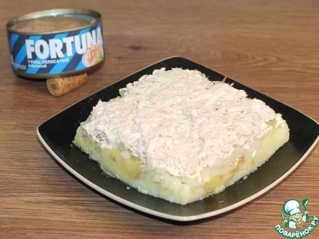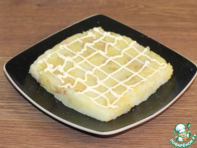 6. Первым слоем выкладываем на блюдо: картофель, солим и немного смазываем майонезом.