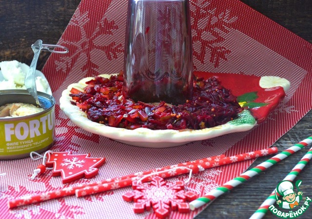 Тунец измельчить вилкой, разложить на свекольную массу.