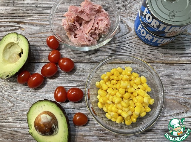 Филе тунца ТМ FORTUNA вилкой разделите на средние кусочки, авокадо очистите и нарежьте.