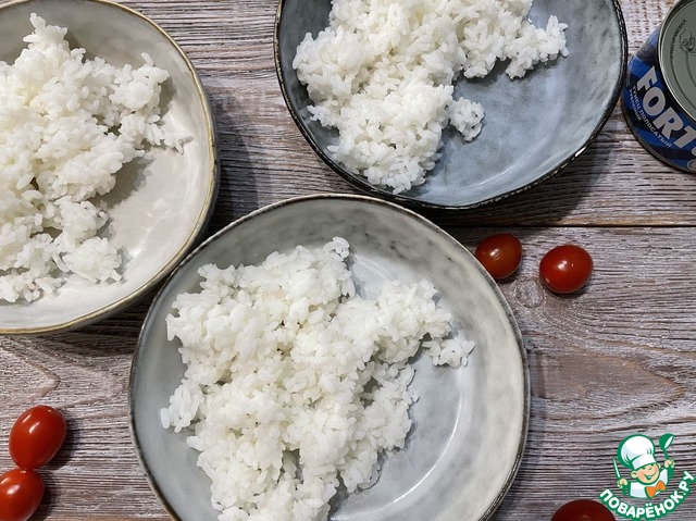 На рис разложите начинку: консервированную кукурузу, филе тунца, салат из морских водорослей чука, помидоры черри, ананас консервированный и кусочки авокадо.