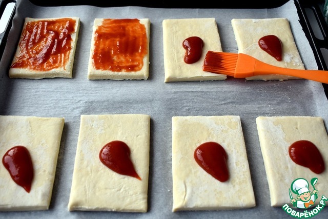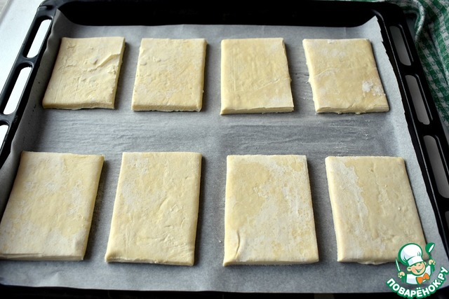 Предварительно размороженное слоеное бездрожжевое тесто выкладываем на противень, застеленный пекарской бумагой.