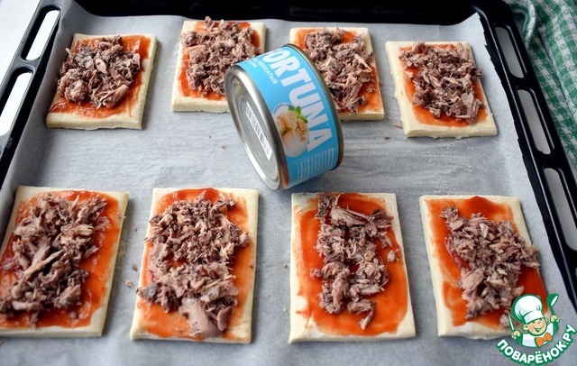 Выкладываем на тесто консервированный тунец, предварительно слив лишнюю заливку из баночки.