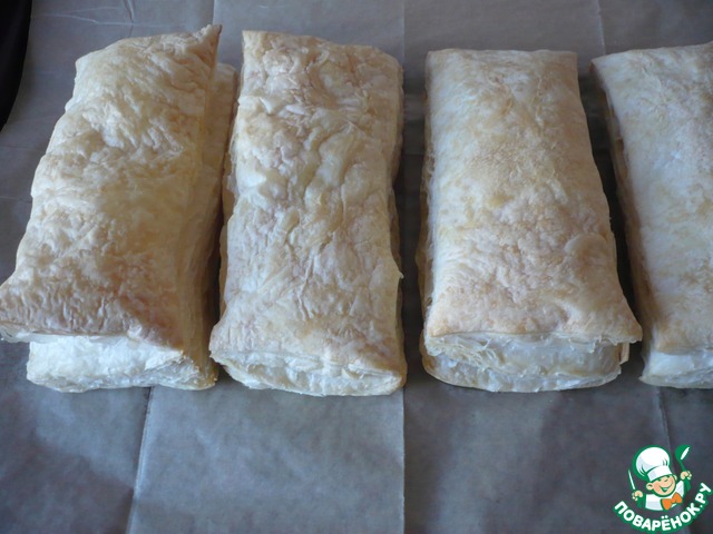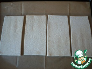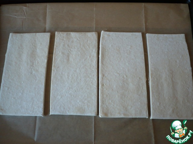 Слоеное бездрожжевое тесто два пласта, разрежьте пополам на две равные части (каждый пласт) и выложите на противень застеленный пергаментной бумагой.