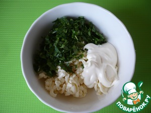 Пока выпекаются коржи для закуски подготовьте все необходимые ингредиенты для намазки коржей. Плавленый сыр натрите на крупной терке, добавьте мелко нарезанную зелень ( у меня петрушка, шнитт-лук) и майонез по вкусу. Все хорошо перемешайте.